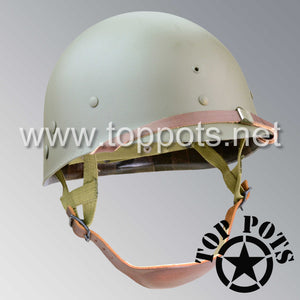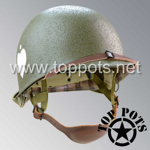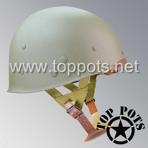 So, if you are looking for a US WWII D ring helmet with the most authentic Type II Mil-Spec 530 11 row weave chain-pattern, A yoke and Herring Bone Twill suspension webbing, this is your helmet. This particular helmet represents the earlier model, which would have been used in combat operations such as the D Day jump into Normandy. This is simply the best WWII M2 helmet for re-enactors, air-soft clubs and collectors made exclusively by Top Pots.
