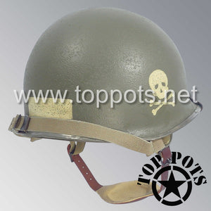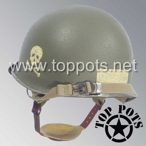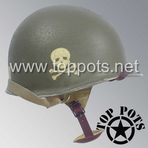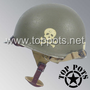 So, if you are looking for a US WWII D ring helmet with the most authentic Type II Mil-Spec 530 11 row weave chain-pattern, A yoke and Herring Bone Twill suspension webbing, this is your helmet. This particular helmet represents the earlier model, which would have been used in combat operations such as the D Day jump into Normandy. This is simply the best WWII M2 helmet for re-enactors, air-soft clubs and collectors made exclusively by Top Pots.