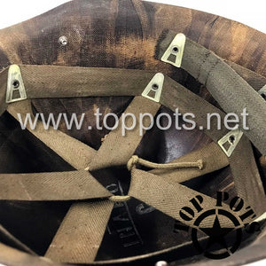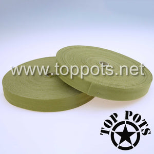Reproduction French Army M51 M53 M56 helmet liner cotton olive drab 3 herring bone twill HBT suspension material. It is an excellent replication and adorned our restored original liners the first few year of our business. It is the standard single weave pattern 20 mm wide HBT M1 liner suspension webbing, but with a slightly wider rib (space) between the weaves, which has been found on SOME US WWII era liner suspensions.