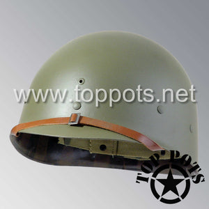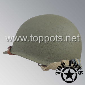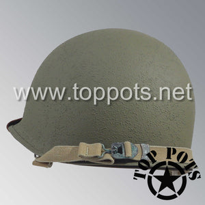 So, if you are looking for a US WWII fix bale helmet with the most authentic Type II Mil-Spec 530 11 row weave chain-pattern and Herring Bone Twill suspension webbing, this is your helmet. This particular helmet represents the earlier model, which would have been used in combat operations such as in New Guinea, North Africa, Italy and D Day. This is simply the best WWII M1 helmet for re-enactors, air-soft clubs and collectors made exclusively by Top Pots.