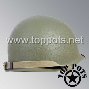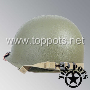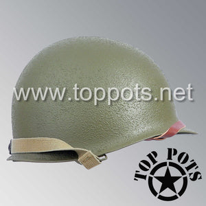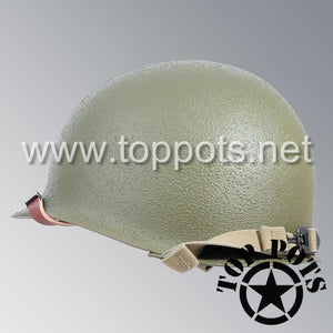 So, if you are looking for a US WWII swivel bale helmet with the most authentic Type II Mil-Spec 530 11 row weave chain-pattern and Herring Bone Twill suspension webbing, this is your helmet. This particular helmet represents the standard model, which would have been used in combat operations such as D Day, Operation Market Garden and the Battle of Okinawa. This is simply the best WWII M1 helmet for re-enactors, air-soft clubs and collectors made exclusively by Top Pots.