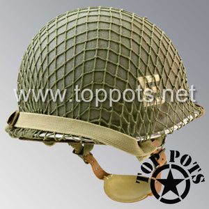 WWII US Army Aged Original M2 Paratrooper Airborne Helmet D Bale Shell and Liner with 326th Airborne Engineer Battalion AEB Emblem and Net