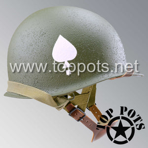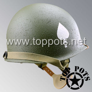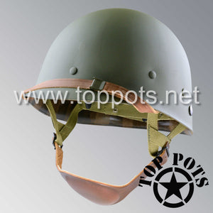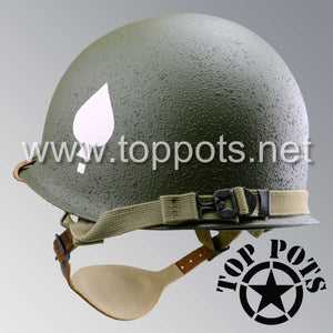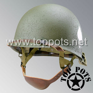 So, if you are looking for a US WWII M1C swivel bale jump helmet with the most authentic Type II Mil-Spec 530 11 row weave chain-pattern, A yoke and Herring Bone Twill suspension webbing, this is your helmet. This particular helmet represents the standard model, which would have been used in combat operations such as the D Day and Market Garden. This is simply the best WWII M1C paratrooper helmet for re-enactors, air-soft clubs and collectors made exclusively by Top Pots.