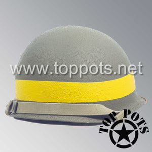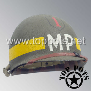 WWII US Army Restored Original M1 Infantry Helmet Swivel Bale Shell and Liner with 1st Infantry Division Military Police Divisional MP Emblem