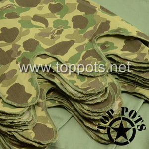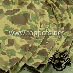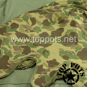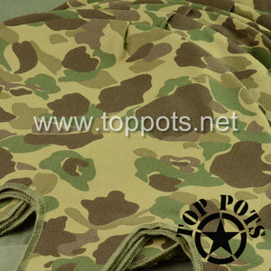 This is a reproduction of the WWII United States Marine Corps M1 Helmet USMC Camouflage Cover. This fully reversible helmet cover has a green tone Jungle Foliage pattern on one side and a brown Beach Landing pattern on the other side. This item is made from 100 percent cotton HBT and is the first pattern model without the foliage slits and no EGA.