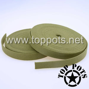 Reproduction WWII US Army M1 helmet cotton olive drab 3 chin strap webbing material. It is an excellent replication and adorned our helmets for the first decade or so of business. It is the standard 11 row weave chain pattern 20 mm wide chin strap webbing being used by most vendors today.
