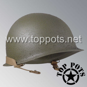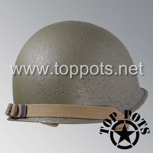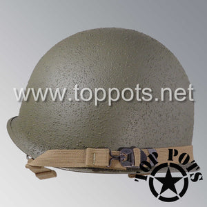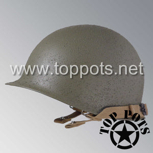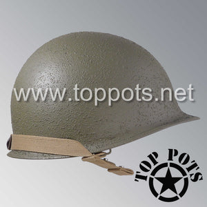 So, if you are looking for a US WWII swivel bale helmet with the most authentic Type II Mil-Spec 530 11 row weave chain-pattern chinstrap webbing, this is your helmet. This particular helmet represents the standard model, which would have been used in combat operations such as the D Day jump into Normandy. This is simply the best WWII M1C helmet for re-enactors, air-soft clubs and collectors made exclusively by Top Pots.