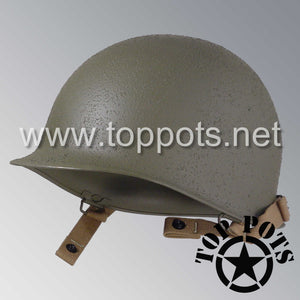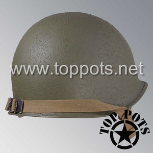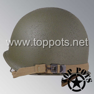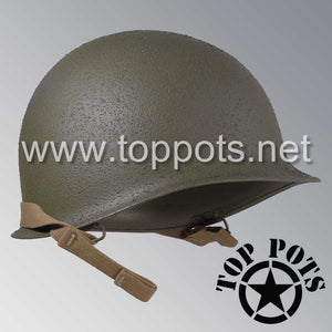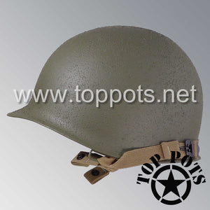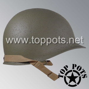 So, if you are looking for a US WWII swivel bale helmet with the most authentic Type II Mil-Spec 530 11 row weave chain-pattern chinstrap webbing, this is your helmet. This particular helmet represents the standard model, which would have been used in combat operations such as the D Day jump into Normandy. This is simply the best WWII M1C helmet for re-enactors, air-soft clubs and collectors made exclusively by Top Pots.