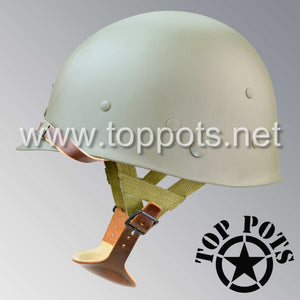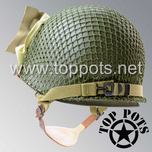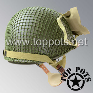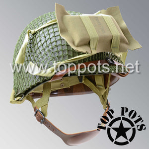 So, if you are looking for a US WWII M1C swivel bale jump helmet with the most authentic Type II Mil-Spec 530 11 row weave chain-pattern, A yoke and Herring Bone Twill suspension webbing, this is your helmet. This particular helmet represents the standard model, which would have been used in combat operations such as the D Day and Market Garden. This is simply the best WWII M1C paratrooper helmet for re-enactors, air-soft clubs and collectors made exclusively by Top Pots.