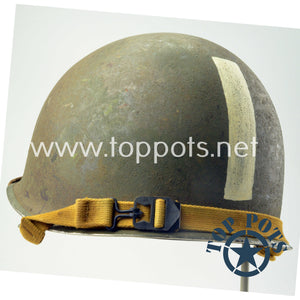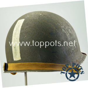 This is an original paint finish US WWII M1 helmet, liner with accessories that has been restored to represent what a Four Star US Army General would have worn during WWII. This helmet has been completed with painstaking detail, such as the use of United Carr marked hardware on the liner nape strap and, more importantly, the presence of actual shuttle loomed 20/2 mercerized yarn HBT suspension webbing. The historically accurate chinstrap webbing was made on the only functional original WWII era shuttle looms in existence.