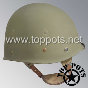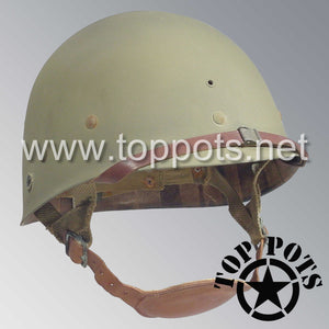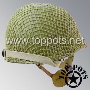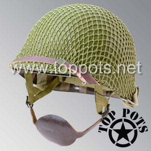 So, if you are looking for a US WWII M1C swivel bale jump helmet with the most authentic Type II Mil-Spec 530 11 row weave chain-pattern, A yoke and Herring Bone Twill suspension webbing, this is your helmet. This particular helmet represents the standard model, which would have been used in combat operations such as the D Day and Market Garden. This is simply the best WWII M1C paratrooper helmet for re-enactors, air-soft clubs and collectors made exclusively by Top Pots.