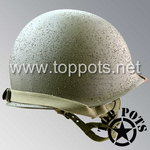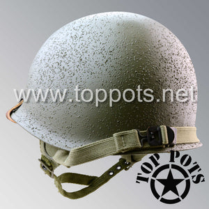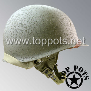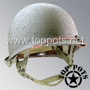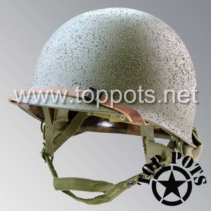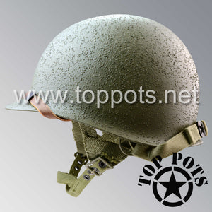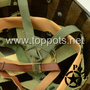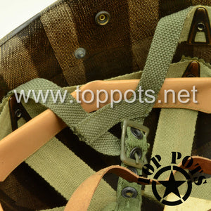 So, if you are looking for a US WWII D ring helmet with the most authentic Type II Mil-Spec 530 11 row weave chain-pattern, A yoke and Herring Bone Twill suspension webbing, this is your helmet. This particular helmet represents the earlier model, which would have been used in combat operations such as the D Day jump into Normandy. This is simply the best WWII M2 helmet for re-enactors, air-soft clubs and collectors made exclusively by Top Pots.
