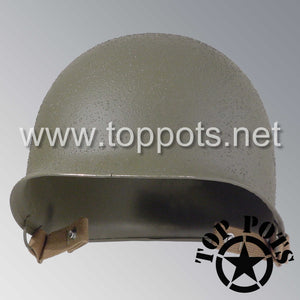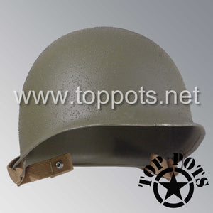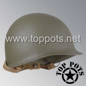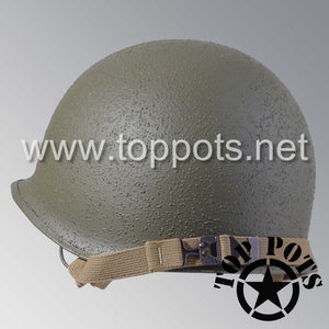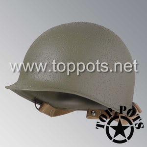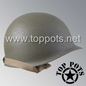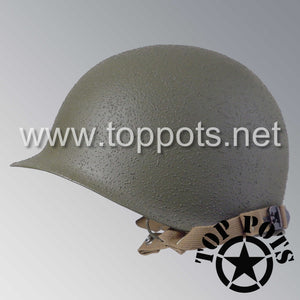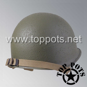 So, if you are looking for a US WWII D ring helmet with the most authentic Type II Mil-Spec 530 11 row weave chain-pattern chinstrap webbing, this is your helmet. This particular helmet represents the earlier model, which would have been used in combat operations such as the D Day jump into Normandy. This is simply the best WWII M2 helmet for re-enactors, air-soft clubs and collectors made exclusively by Top Pots.