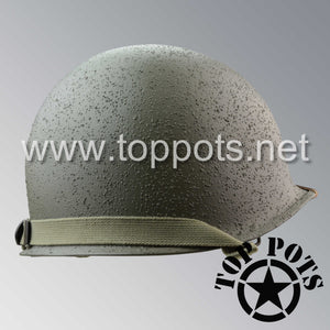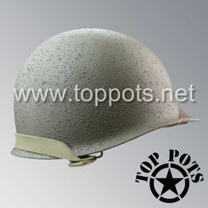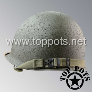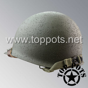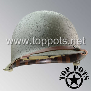 So, if you are looking for a US WWII fix bale helmet with the most authentic Type II Mil-Spec 530 11 row weave chain-pattern and Herring Bone Twill suspension webbing, this is your helmet. This particular helmet represents the earlier model, which would have been used in combat operations such as in New Guinea, North Africa, Italy and D Day. This is simply the best WWII M1 helmet for re-enactors, air-soft clubs and collectors made exclusively by Top Pots.