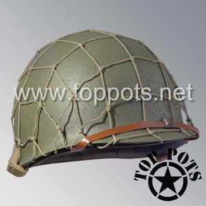 WWII US Army Restored Original M1 Infantry Helmet Fix Bale Shell and Liner with Early War Leather Chinstrap and Large Cargo Net