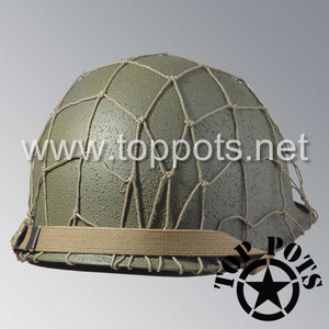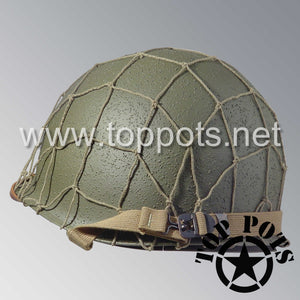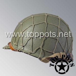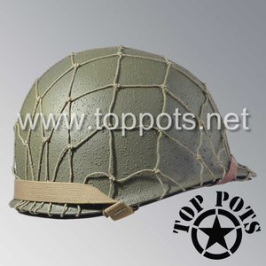 So, if you are looking for a US WWII fix bale helmet with the most authentic Type II Mil-Spec 530 11 row weave chain-pattern and Herring Bone Twill suspension webbing, this is your helmet. This particular helmet represents the earlier model, which would have been used in combat operations such as in New Guinea, North Africa, Italy and D Day. This is simply the best WWII M1 helmet for re-enactors, air-soft clubs and collectors made exclusively by Top Pots.