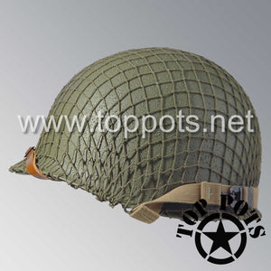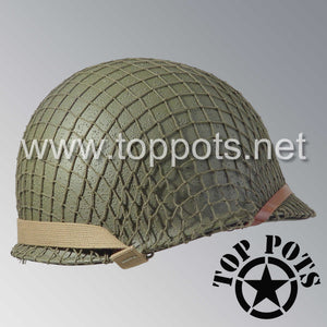 So, if you are looking for a US WWII fix bale helmet with the most authentic Type II Mil-Spec 530 11 row weave chain-pattern and Herring Bone Twill suspension webbing, this is your helmet. This particular helmet represents the earlier model, which would have been used in combat operations such as in New Guinea, North Africa, Italy and D Day. This is simply the best WWII M1 helmet for re-enactors, air-soft clubs and collectors made exclusively by Top Pots.