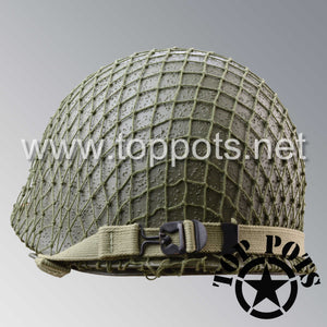 So, if you are looking for a US WWII swivel bale helmet with the most authentic Type II Mil-Spec 530 11 row weave chain-pattern and Herring Bone Twill suspension webbing, this is your helmet. This particular helmet represents the standard model, which would have been used in combat operations such as D Day, Operation Market Garden and the Battle of Okinawa. This is simply the best WWII M1 helmet for re-enactors, air-soft clubs and collectors made exclusively by Top Pots.