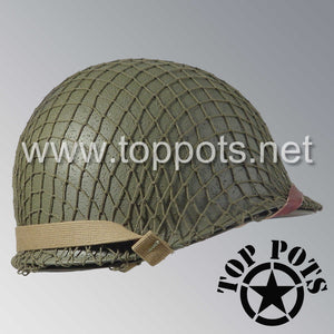 So, if you are looking for a US WWII swivel bale helmet with the most authentic Type II Mil-Spec 530 11 row weave chain-pattern and Herring Bone Twill suspension webbing, this is your helmet. This particular helmet represents the standard model, which would have been used in combat operations such as D Day, Operation Market Garden and the Battle of Okinawa. This is simply the best WWII M1 helmet for re-enactors, air-soft clubs and collectors made exclusively by Top Pots.