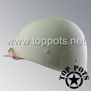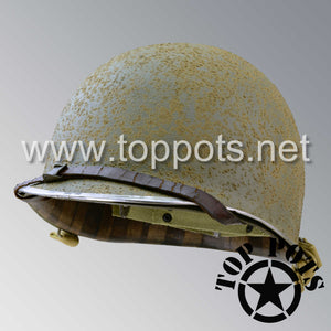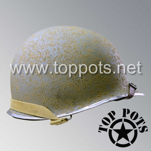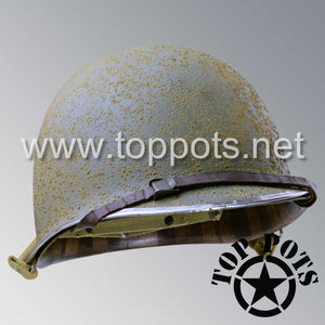 So, if you are looking for a US WWII fix bale helmet with the most authentic Type II Mil-Spec 530 11 row weave chain-pattern and Herring Bone Twill suspension webbing, this is your helmet. This particular helmet represents the earlier model, which would have been used in combat operations such as in New Guinea, North Africa, Italy and D Day. This is simply the best WWII M1 helmet for re-enactors, air-soft clubs and collectors made exclusively by Top Pots.