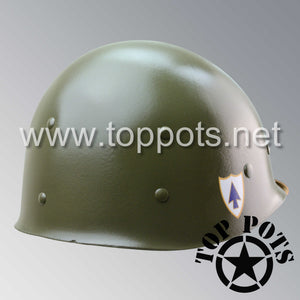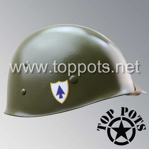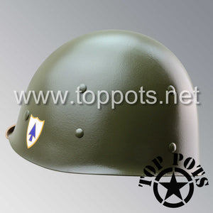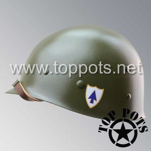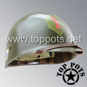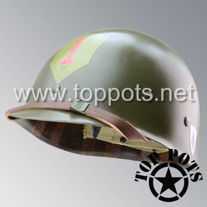 WWII US Army Restored Original M1 Infantry Helmet Liner with 26th Infantry Regiment 1st Infantry Division Blue Spaders Nuremberg Trial Emblem