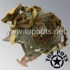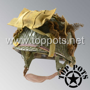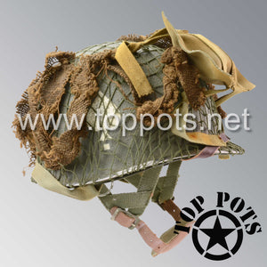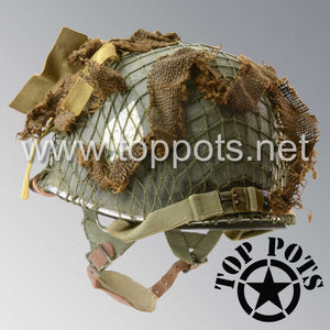 So, if you are looking for a US WWII M1C swivel bale jump helmet with the most authentic Type II Mil-Spec 530 11 row weave chain-pattern, A yoke and Herring Bone Twill suspension webbing, this is your helmet. This particular helmet represents the standard model, which would have been used in combat operations such as the D Day and Market Garden. This is simply the best WWII M1C paratrooper helmet for re-enactors, air-soft clubs and collectors made exclusively by Top Pots.