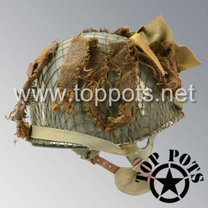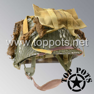 WWII US Army Aged Original M1C Paratrooper Airborne Helmet Swivel Bale Shell and Liner with 506th 2nd Battalion PIR Emblem, Net, Medic Pack and Scrim