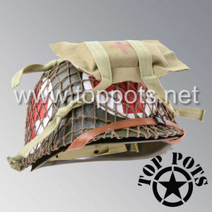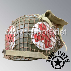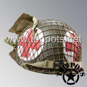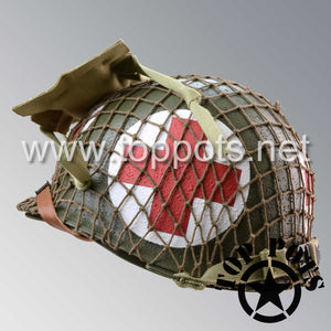 WWII US Army Reproduction M1 Infantry Helmet Swivel Bale Shell and Liner with Four Panel Medic Emblem, Net and Medic Pack