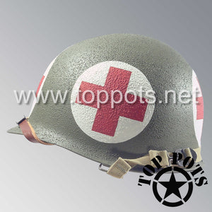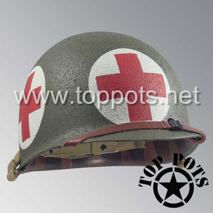 WWII US Army Restored Original M1 Infantry Helmet Swivel Bale Shell and Liner with Four Panel Medic Emblem - MASH Film and TV Series