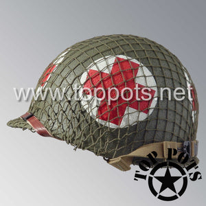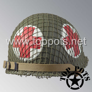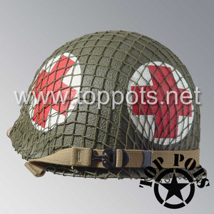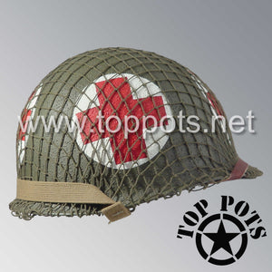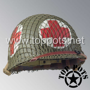 WWII US Army Restored Original M1 Infantry Helmet Swivel Bale Shell and Liner with Four Panel Medic Emblem with OD 7 Net