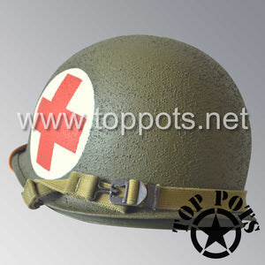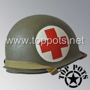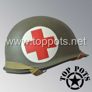 WWII US Army Restored Original M1 Infantry Helmet Swivel Bale Shell and Liner with Two Panel Medic Emblem