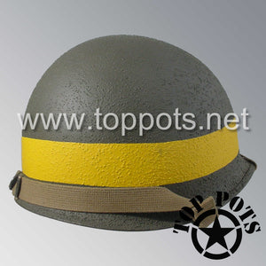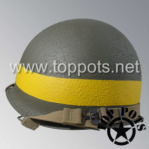 So, if you are looking for a US WWII swivel bale helmet with the most authentic Type II Mil-Spec 530 11 row weave chain-pattern and Herring Bone Twill suspension webbing, this is your helmet. This particular helmet represents the standard model, which would have been used in combat operations such as D Day, Operation Market Garden and the Battle of Okinawa. This is simply the best WWII M1 helmet for re-enactors, air-soft clubs and collectors made exclusively by Top Pots.