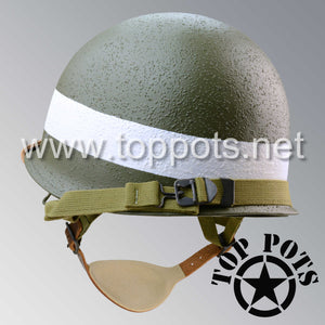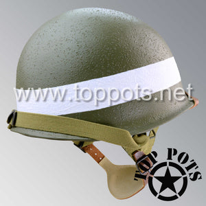 So, if you are looking for a US WWII M1C swivel bale jump helmet with the most authentic Type II Mil-Spec 530 11 row weave chain-pattern, A yoke and Herring Bone Twill suspension webbing, this is your helmet. This particular helmet represents the standard model, which would have been used in combat operations such as the D Day and Market Garden. This is simply the best WWII M1C paratrooper helmet for re-enactors, air-soft clubs and collectors made exclusively by Top Pots.