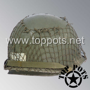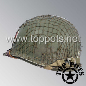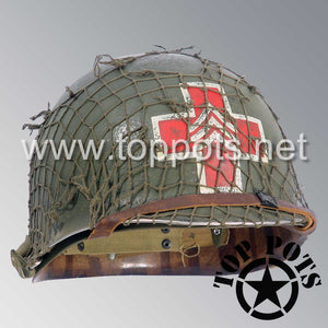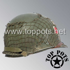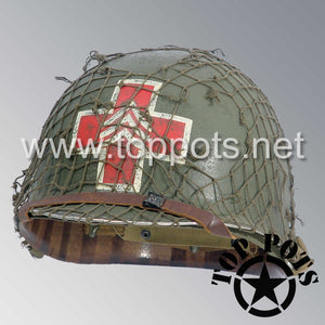 WWII US Army Aged Original M1 Infantry Helmet Swivel Bale Shell and Liner with Single Panel Medic NCO Emblem with Net