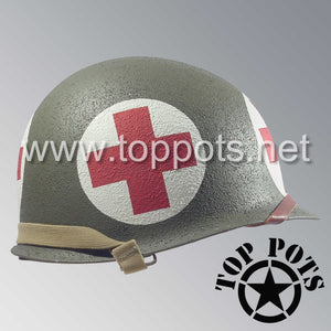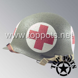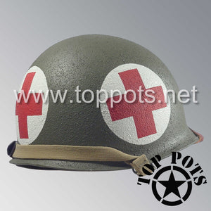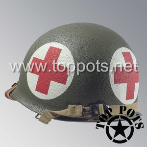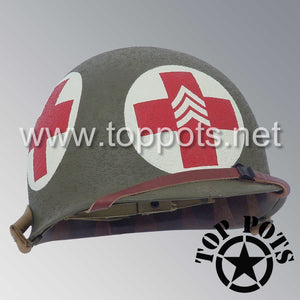 WWII US Army Restored Original M1 Infantry Helmet Swivel Bale Shell and Liner with Four Panel Medic NCO Emblem