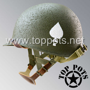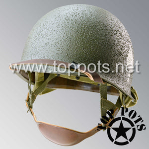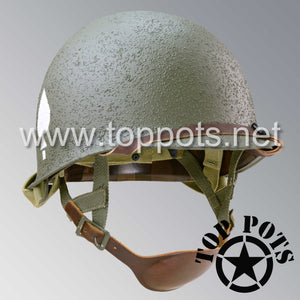 So, if you are looking for a US WWII M1C swivel bale jump helmet with the most authentic Type II Mil-Spec 530 11 row weave chain-pattern, A yoke and Herring Bone Twill suspension webbing, this is your helmet. This particular helmet represents the standard model, which would have been used in combat operations such as the D Day and Market Garden. This is simply the best WWII M1C paratrooper helmet for re-enactors, air-soft clubs and collectors made exclusively by Top Pots.