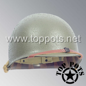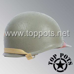 This listing is for an all reproduction M1 shell and liner, with full accessories, that has been restored to represent a WWII era M1 swivel bale infantry helmet. This helmet restoration has been done with painstaking detail. It even has a set of olive drab #3 chinstraps, whose webbing was made on one of our three original WWII era Shuttle Looms, something we normally reserve for use only on our genuine WWII era helmet restorations.
