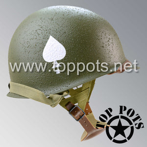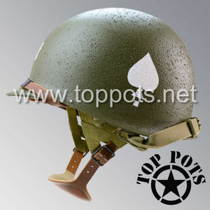 So, if you are looking for a US WWII M1C swivel bale jump helmet with the most authentic Type II Mil-Spec 530 11 row weave chain-pattern, A yoke and Herring Bone Twill suspension webbing, this is your helmet. This particular helmet represents the standard model, which would have been used in combat operations such as the D Day and Market Garden. This is simply the best WWII M1C paratrooper helmet for re-enactors, air-soft clubs and collectors made exclusively by Top Pots.