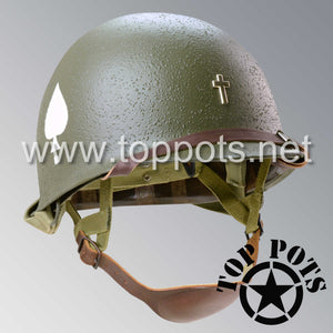 WWII US Army Restored Original M2 Paratrooper Airborne Helmet D Bale Shell and Liner with 506th 2nd Battalion PIR Chaplain Officer Emblem