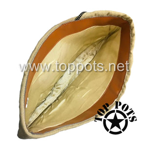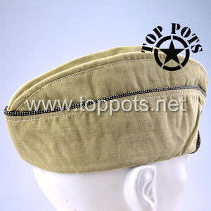 This is a reproduction of the WWII US Army Khaki Cotton Officer Summer Uniform Garrison Overseas Cap – also known as Cap, Garrison, Khaki. This khaki cotton twill uniform overseas cap has the officer black and gold piping. It was the summer issue garrison cap for the US Army and saw extensive use in the Pacific Theater during WWII.