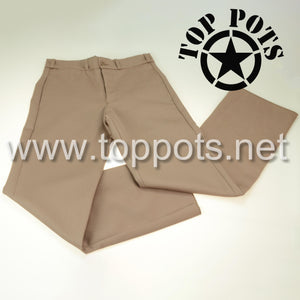 This is a reproduction of the WWII US Army M1937 Pink Wool Elastique Uniform Trouser Pants. These high waist officer service uniform pants are made with an expensive double weave wool elastique material, which is determined by the diagonal line within the pattern and keeps creases longer, not prone to wrinkling and, though 100% wool, very cool to wear. These officer pants have straight legs, two hip pockets, two rear pockets, button fly, small front watch pocket and belt loops.