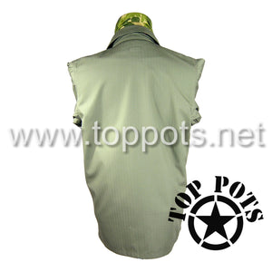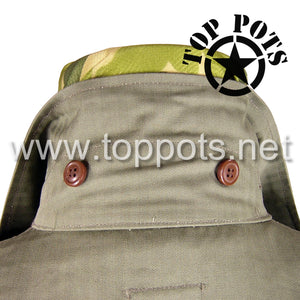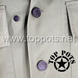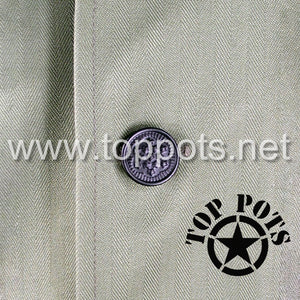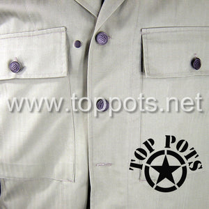 This is a reproduction of the WWII US Army M1942 Cotton HBT Uniform Herring Bone Twill Field Fatigue Jacket. This loose fitting fatigue jacket has two large flap square flapped chest pockets, gas flap, six button front and metal star buttons.