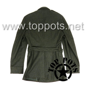 This is a reproduction of the WWII USMC M1937 Green Wool Marine Corps Service Dress Coat Jacket. It includes cloth waist belt with buckle.