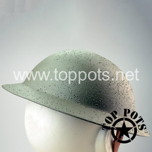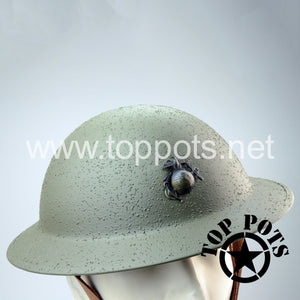 This is a reproduction of the WWI USMC Helmet based upon the WWI British Army M1916 MKI Enlisted Brodie Helmet pattern. Comes complete as shown with WWI era United States Marine Corps Eagle, Globe and Anchor (EGA) insignia mounted in the crest. The helmet is complete with copper rivet attached padded felt liner, one piece leather chinstrap and field textured finish. Liner sizes are based on head circumference, so reach out to us if you need help determining size.
