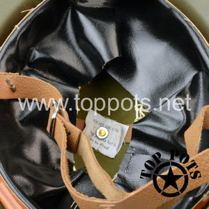 This is a reproduction of the early model WWI US Army M1917 Brodie Helmet, as over 500,000 of these helmets were provided to America by the British Army. The helmet is complete with copper rivet attached padded felt liner, one piece leather chinstrap and field textured finish. Liner sizes are based on head circumference, so reach out to us if you need help determining size. Custom divisional emblems are available for an extra fee.