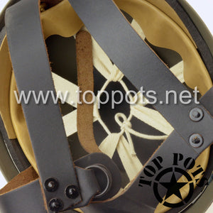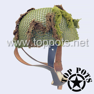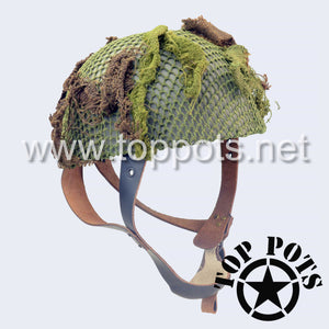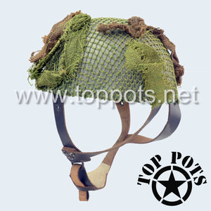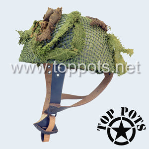 This is a reproduction of the WWII British Army Reproduction M1943 MKI Paratrooper Airborne Helmet with Original Net and Scrim – officially known as the Helmet Steel Airborne Troop MK I. This all reproduction British Paratrooper Helmet comes complete as shown with steel helmet, oval crown bumper pad, shock absorbing pads, leather sweatband with felt underlay, QM stamps, fully adjustable three point leather chinstrap and an original WWII era paratrooper helmet net with scrim. The helmet liners for these are based on head circumference, so please contact us for sizing assistance.