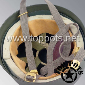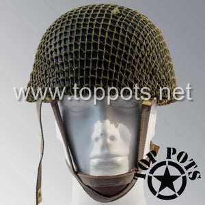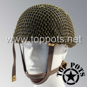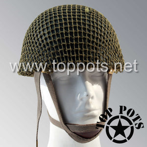 This is a reproduction of the WWII British Army Reproduction M1944 MKII MK2 Paratrooper Airborne Helmet with Original Net and Scrim – officially known as the Helmet Steel Airborne Troop MK II MK2. This all reproduction British Paratrooper Helmet comes complete as shown with steel helmet, oval crown bumper pad, shock absorbing pads, leather sweatband with felt underlay, QM stamps, fully adjustable three point canvas chinstrap and an original WWII era paratrooper helmet net with scrim. The helmet liners for these are based on head circumference, so please contact us for sizing assistance.