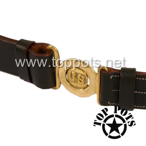 This is a reproduction of the WWII US Army Reproduction M1911 Leather Officer Waist Belt with Brass Oval US Buckle. It consists of a beautifully stitched wide russet brown leather belt with embossed "US" buckle (smooth oval only). This belt is fully adjustable and you will be sized to ensure it will fit you.