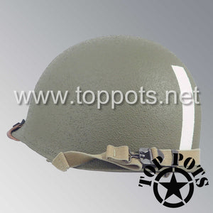 So, if you are looking for a US WWII swivel bale helmet with the most authentic Type II Mil-Spec 530 11 row weave chain-pattern and Herring Bone Twill suspension webbing, this is your helmet. This particular helmet represents the standard model, which would have been used in combat operations such as D Day, Operation Market Garden and the Battle of Okinawa. This is simply the best WWII M1 helmet for re-enactors, air-soft clubs and collectors made exclusively by Top Pots.