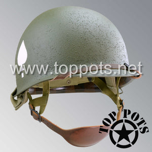So, if you are looking for a US WWII M1C swivel bale jump helmet with the most authentic Type II Mil-Spec 530 11 row weave chain-pattern, A yoke and Herring Bone Twill suspension webbing, this is your helmet. This particular helmet represents the standard model, which would have been used in combat operations such as the D Day and Market Garden. This is simply the best WWII M1C paratrooper helmet for re-enactors, air-soft clubs and collectors made exclusively by Top Pots.